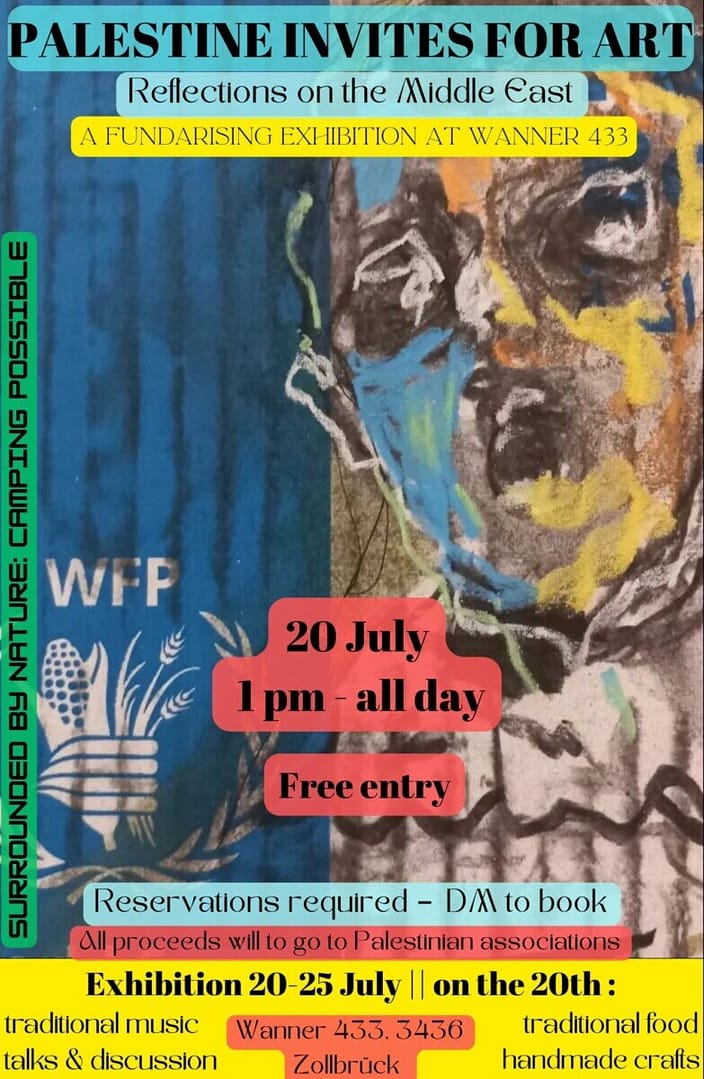 From July 20th to 25th, I will be exhibiting my Palestine-themed artworks in the exhibition “Palestine invites you to Art at the Kulturbauernhof Wanner 433,” a wonderfully idyllic space full of art.