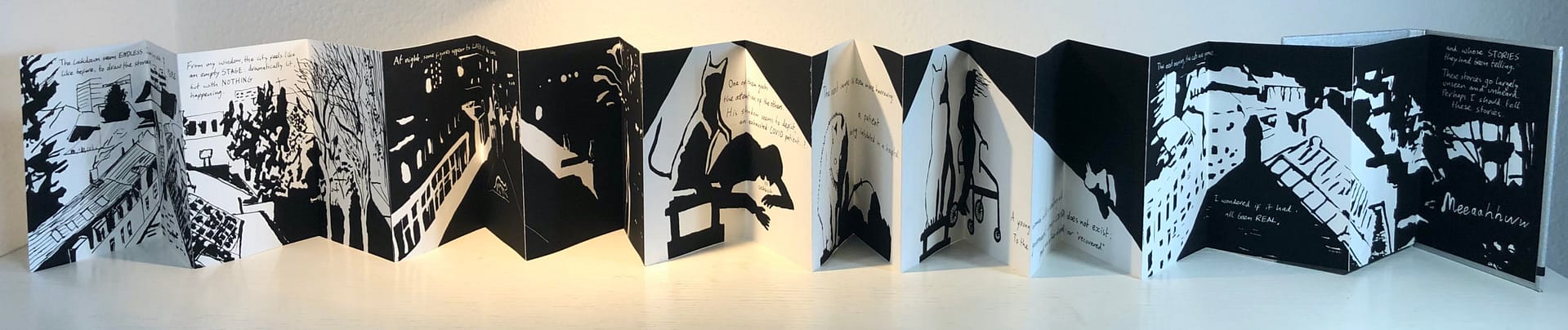 20-page Leporello comic. This is a magical-realistic story about a cartoonist who, bored during lockdown, gets lectured about the devastating effects of Long-COVID-19 by cats in front of his window. The comic is for sale on Etsy.
