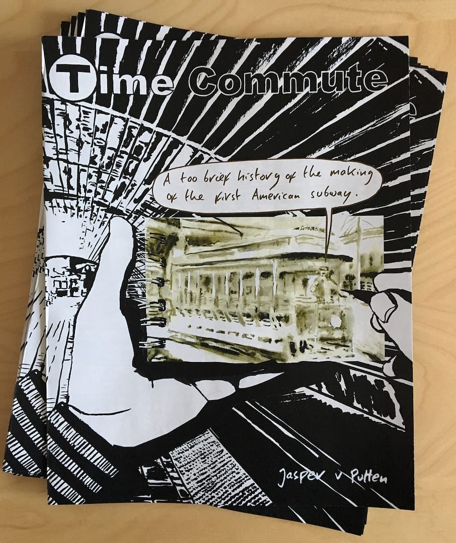 Time Commute is a seven-page comic (8 including front cover) about the making of the Boston subway told from the perspective of someone who draws people on the subway (or actually through his drawings…, anyway you just have to read it…). The comic combines drawings in ink that I made during my commute on the Boston subway (all on the spot), with watercolors in sepia that depict scenes from the past, based on historic photographs.