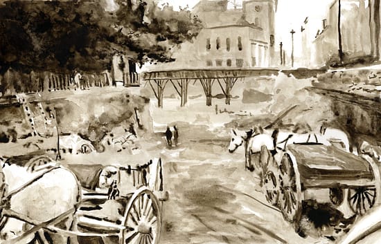 Construction of the Boston Subway in 1895 along Tremont Street beside the Boston Common, based on a photograph from Boston Carmen’s Union, Local 589...