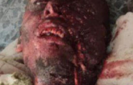 Rescue worker holds the leg of a martyr from the Al-Helo family in Al-Sana neighbourhood
