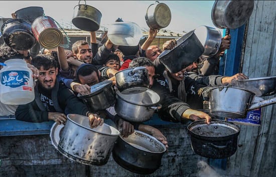 Palestinians Hold Out Containers for Food Aid in Khan Younis
