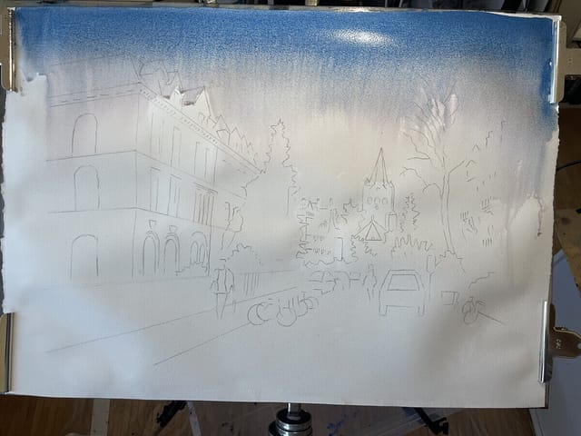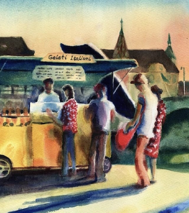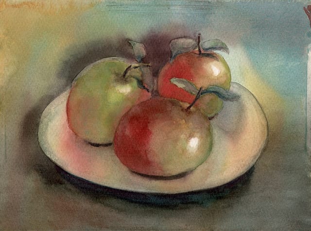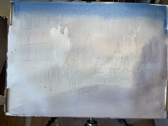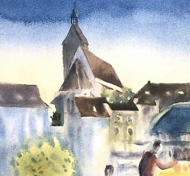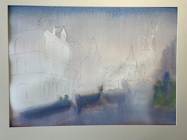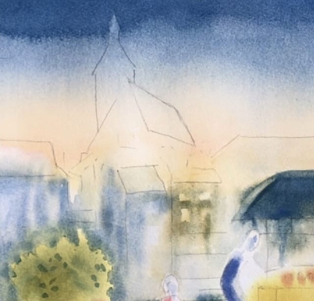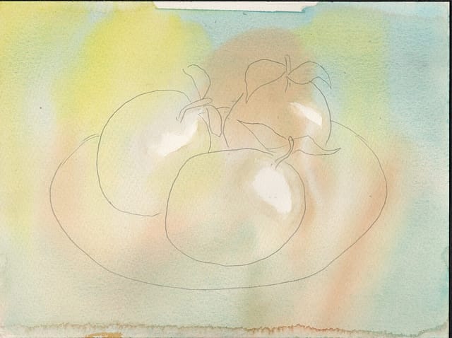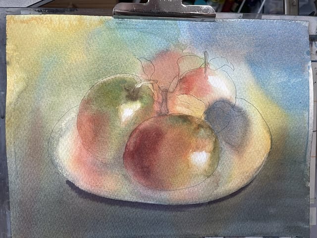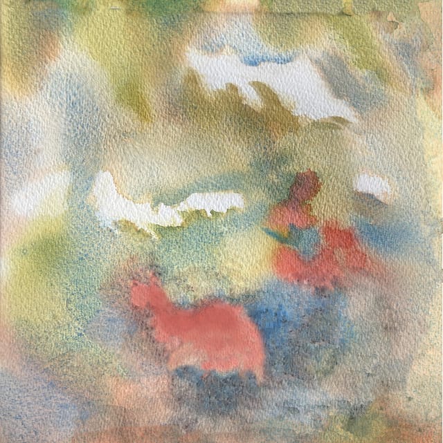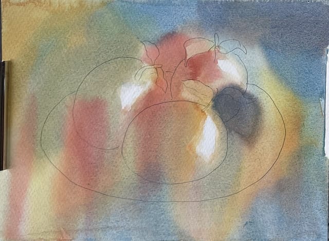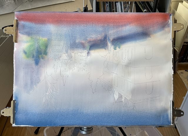 “Abstract” granulation lends itself especially well to color experiments. Imagine that you had uses different colors in the first wash, or the same colors but dropped them in in a different pattern. Below on the right I imagined this and changed the colors digitally. I would of course use other colors or the same colors arranged differently to finish the painting. But if I follow the value study carefully, the atmosphere will then change but the primary form and visual content will not. Be free in your color choices first wash, become increasingly discerning and particular in subsequent washes. Remember, if you paint light to dark and reserve your whites, very little can go wrong.