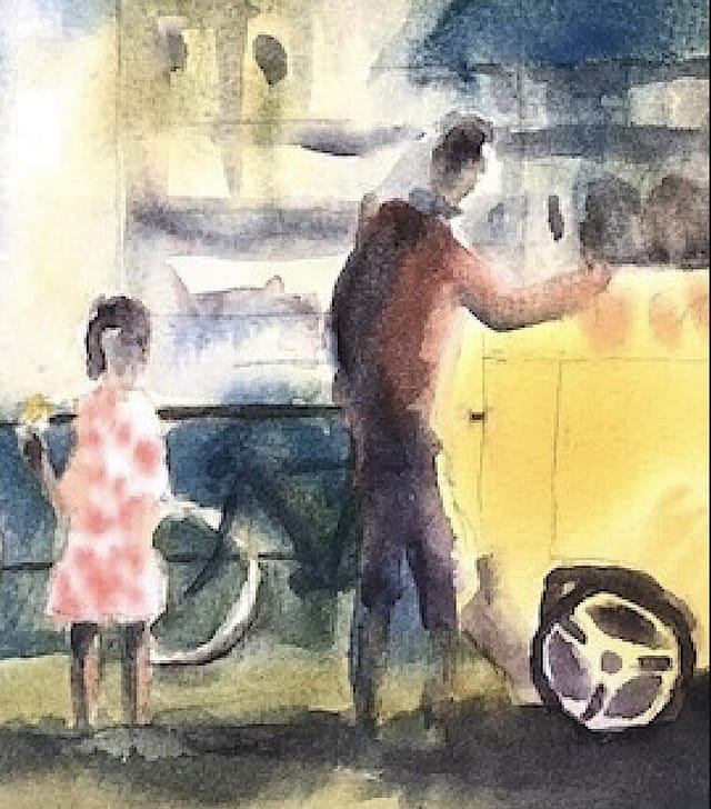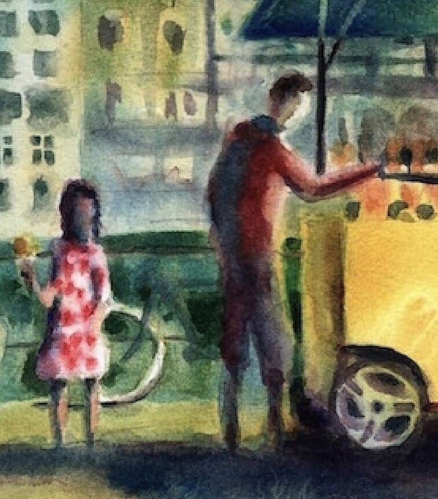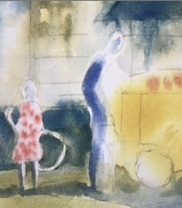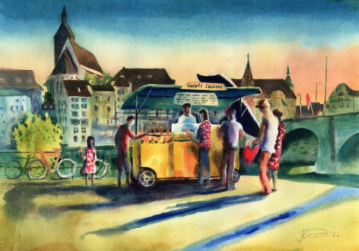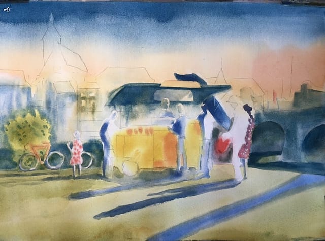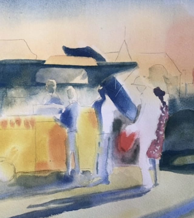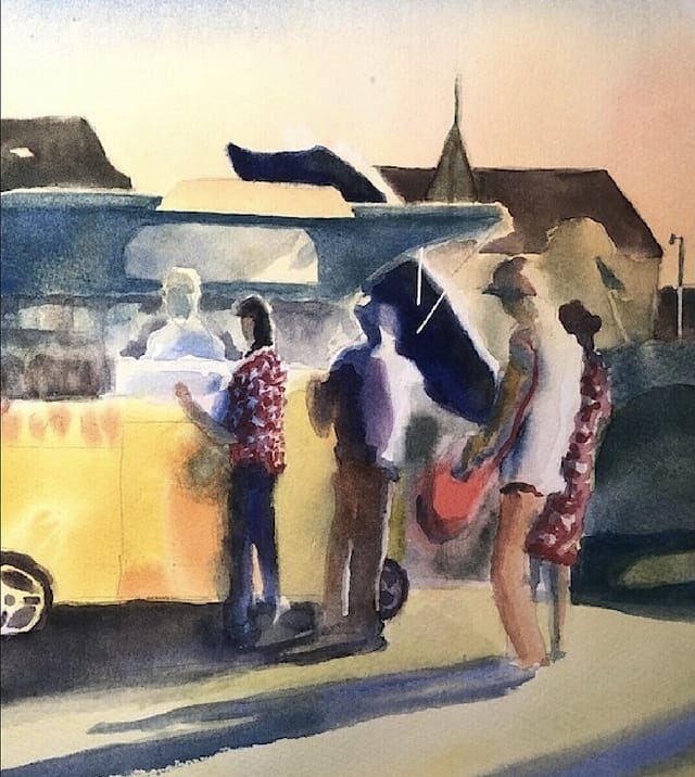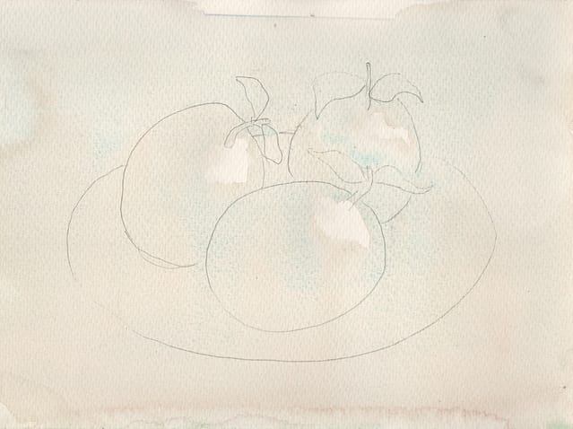“Abstract” granulation lends itself especially well to color experiments. Imagine that you had uses different colors in the first wash, or the same colors but dropped them in in a different pattern. Below on the right I imagined this and changed the colors digitally. I would of course use other colors or the same colors arranged differently to finish the painting. But if I follow the value study carefully, the atmosphere will then change but the primary form and visual content will not. Be free in your color choices first wash, become increasingly discerning and particular in subsequent washes. Remember, if you paint light to dark and reserve your whites, very little can go wrong.